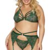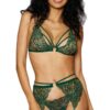 Green scallopped lace with gold metallic accents 3-piece set includes a bralette with cage detailing, a garterbelt and g-string.