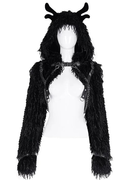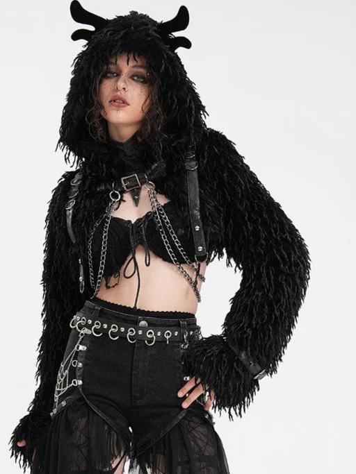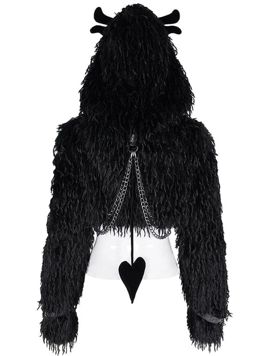 Faux fur cropped jacket with a hood and draped chain trim. Faux leather devil horns and tail.