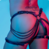 Faux leather harness buckles over your waist and thighs, featuring draped black chains and o-ring accents. Lined with soft black velvet for comfort. Perfect for layering!