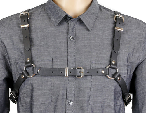 Faux leather 3/4″ wide bulldog harness with adjustable buckles.