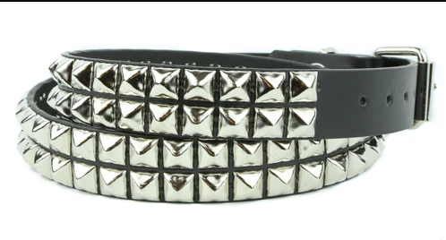 Leather 2-row 1/2″ pyramid stud belt. 1-1/4″ wide. Adjustable buckle. Interchangeable buckle.