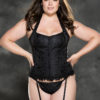 Black jacquard corset with adjustable halter straps features beautiful Venice lace trim.