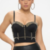 Longline padded underwire bra features studded details and a skull. Best fits B/C cups. Gold tone gardware.