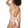 Pretty pink mesh and lace crotchless teddy features strappy details and peek-a-boo cups.