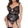 Metallic stretch lace and mesh merrywidow features a front zipper underwire cups, light boning, an adjustable lace-up back, and garters. Includes a matching thong with adjustable side hooks. Rose gold Harware.