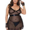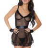 Midnight black stretch nylon dress features underwire cups, ruffle lace trim and a removeable ribbon belt. This set includes matching gloves and a satin headpiece.