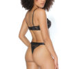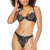 Scalloped stretch lace bra features soft, underwire cups and a centre hook closure. Includes a high waist thong.